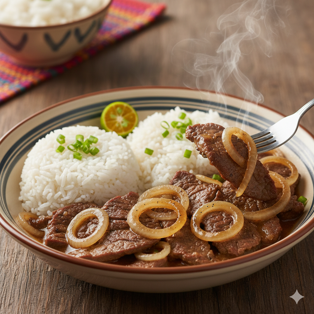비스텍(Bistek)은 필리핀 가정식에서 자주 등장하는 대표적인 소고기 요리입니다. 이름은 스페인어 ‘비프 스테이크(Bistec)’에서 유래했지만, 조리 방식과 맛은 필리핀식으로 완전히 변형되었어요. 간장과 칼라만시(또는 레몬)즙으로 맛을 낸 뒤, 얇게 썬 소고기를 부드럽게 조리하는 것이 핵심입니다.