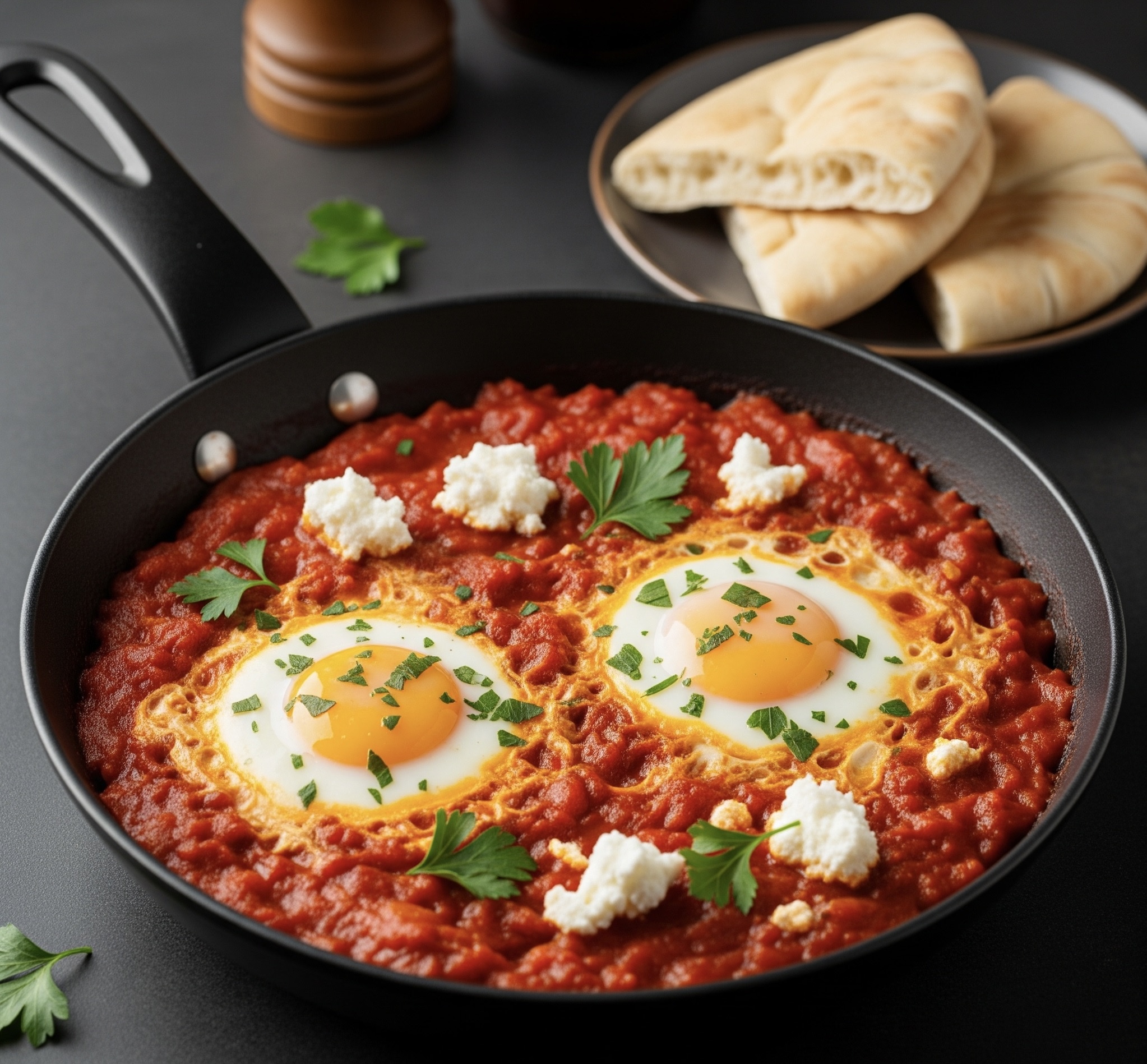 - 따뜻한 나무 도마 위에 팬을 올리고, 옆에는 피타빵과 절임류를 작은 접시에 담아 함께 놓아보세요.