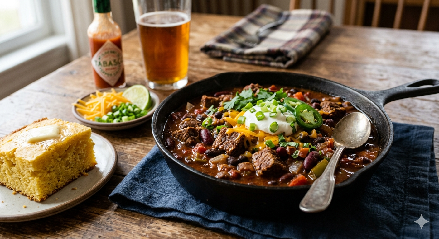 예를 들어 체다 치즈를 듬뿍 올리면 뜨거운 칠리 위에서 천천히 녹으면서 고소함이 더해집니다. 사워크림을 한 스푼 얹으면 매운맛과 산미가 부드럽게 정리되고요. 다진 할라피뇨나 고수를 더하면 훨씬 산뜻하고 또렷한 인상이 납니다. 나초, 콘브레드, 밥, 구운 감자 위에 올리는 방식도 훌륭합니다. 한 냄비 요리이면서도 응용 범위가 넓다는 점이 바로 칠리 콘 카르네의 큰 매력이에요.